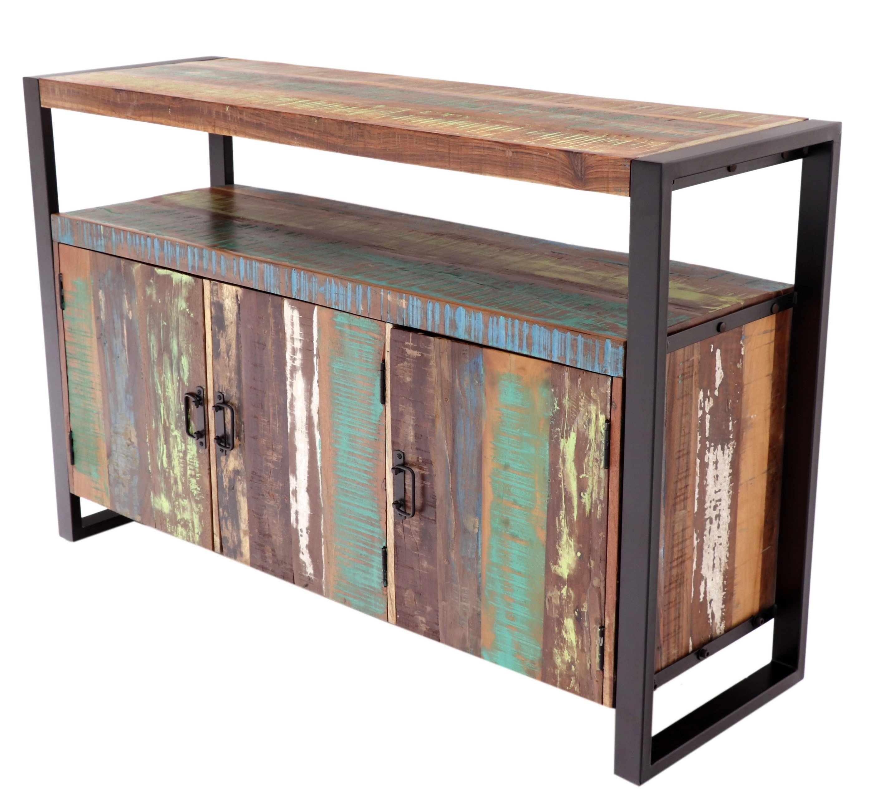 Komoda sa môže pochváliť tromi priestrannými dvierkami s kovovými úchytkami, ktoré ponúkajú veľkorysý úložný priestor na všetky vaše nevyhnutnosti. Každý kus je originálny vďaka recyklovanému masívnemu drevu, ktoré dodáva komode jedinečný charakter a individuálny vzhľad. Táto komoda sa stane nielen praktickým kusom nábytku, ale aj ozdobou vášho domova, ktorá bude priťahovať pohľady všetkých návštevníkov.