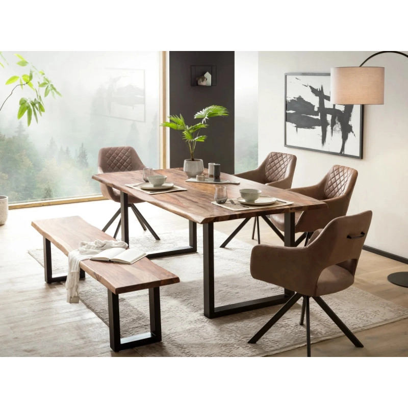 Objavte kúzlo prírodnej elegancie s jedálenskou zostavou Bullwer, ktorá zahŕňa robustný stôl, lavicu a štyri stoličky Corton z kvalitnej lakovanej akácie v teplom hnedom odtieni. Táto masívna zostava je ideálnou voľbou pre štýlové a pohodlné stolovanie vo vašej jedálni.