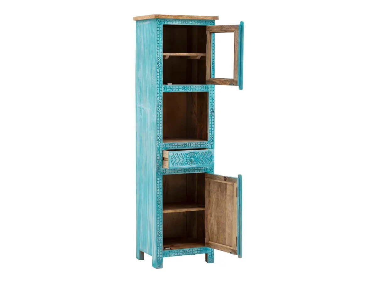 Vďaka starostlivému spracovaniu z kvalitného Holz - Mango, čo je nielen odolný, ale aj ekologicky šetrný materiál, zaručuje dlhú životnosť a krásu. Jej jemné detaily, ako je rukou brúsený povrch a kvalitná povrchová úprava, zabezpečujú, že si skrinka zachováva svoju jedinečnosť. Modrá farba, evokujúca pokojné morské vlny, v kombinácii s prírodným vzhľadom dreva vytvára harmonický kontrast, ktorý vnáša do vašej kúpeľne pocit sviežosti a útulnosti. Navyše praktickosť s rozmermi, ktoré sa skvele hodia aj do menších priestorov, robí z tejto skrinky ideálnu voľbu pre každého, kto hľadá spojenie štýlu a funkčnosti.