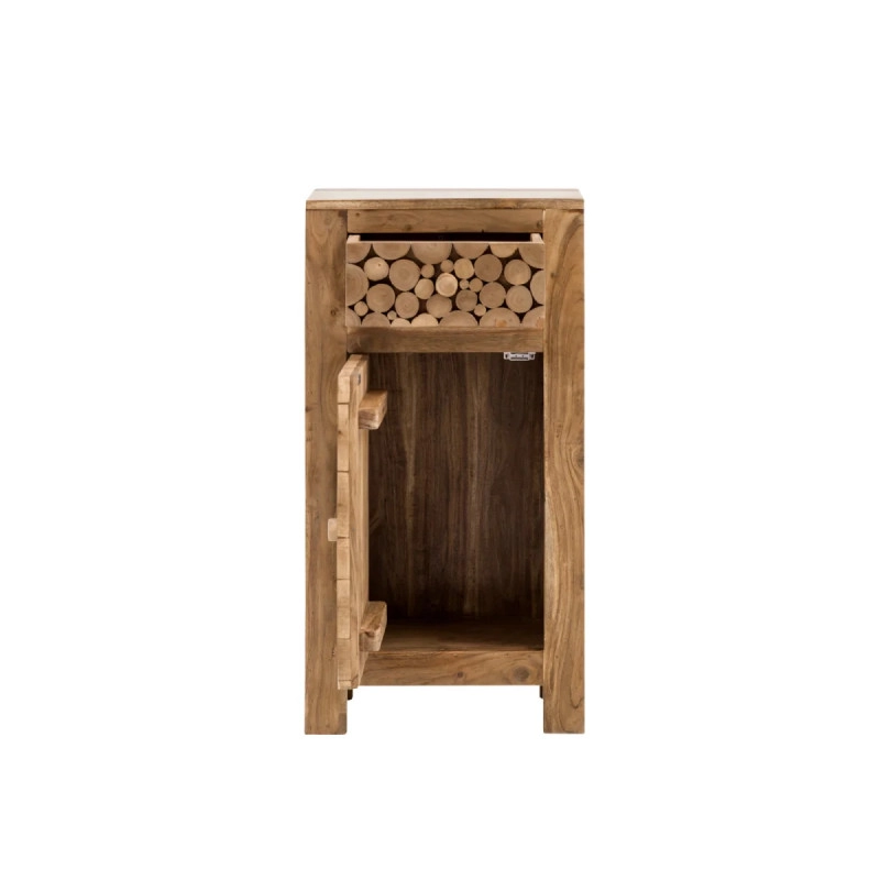 \n\nVyberte si Katha ako stredobod vašej kúpeľne, ktorý nielenže splní funkčné potreby, ale tiež sa stane estetickým prvkom, na ktorý budete hrdí. Jej prírodná akácia vytvára harmóniu s ostatnými drevenými prvkami v interiéri, zatiaľ čo lakovaný povrch uľahčuje údržbu a zaručuje dlhú životnosť. Pri každom pohľade na túto skrinku sa budete cítiť obklopení prírodou a pokojným prostredím. Neotálejte a premeňte svoju kúpeľňu na miesto, kde sa budete radi zastavovať a relaxovať. Objednajte si masívnu kúpeľňovú skrinku Katha ešte dnes a užívajte si harmóniu, ktorú prináša!