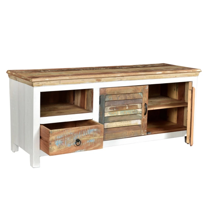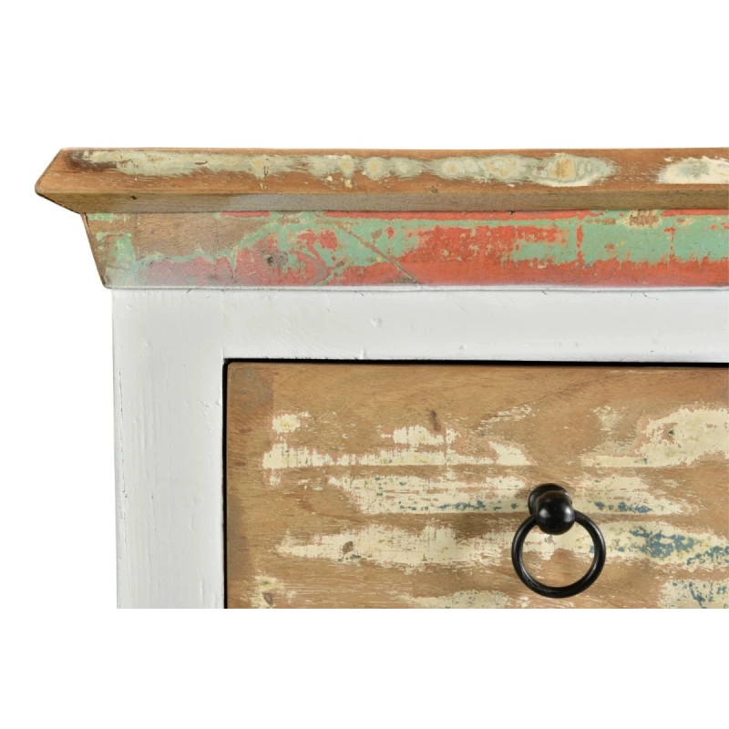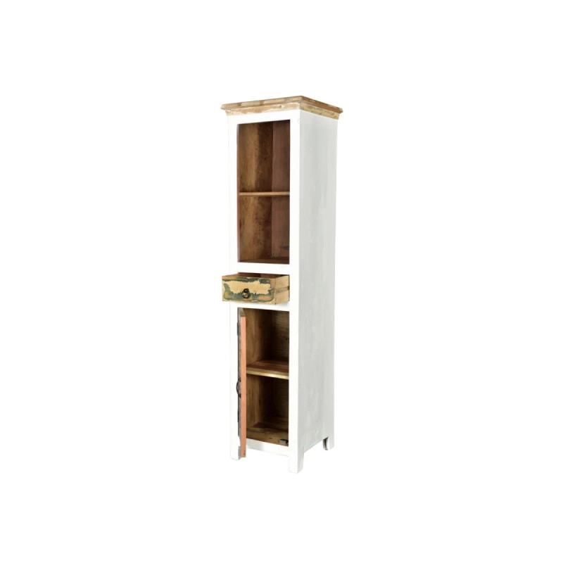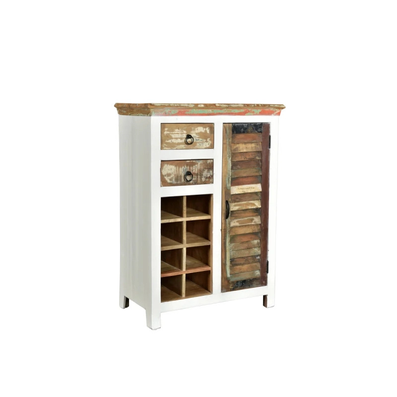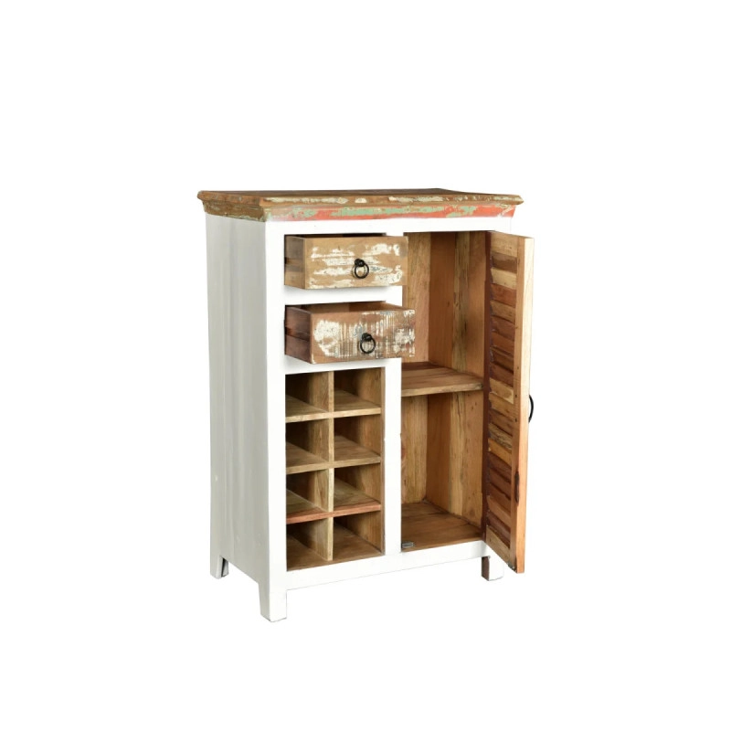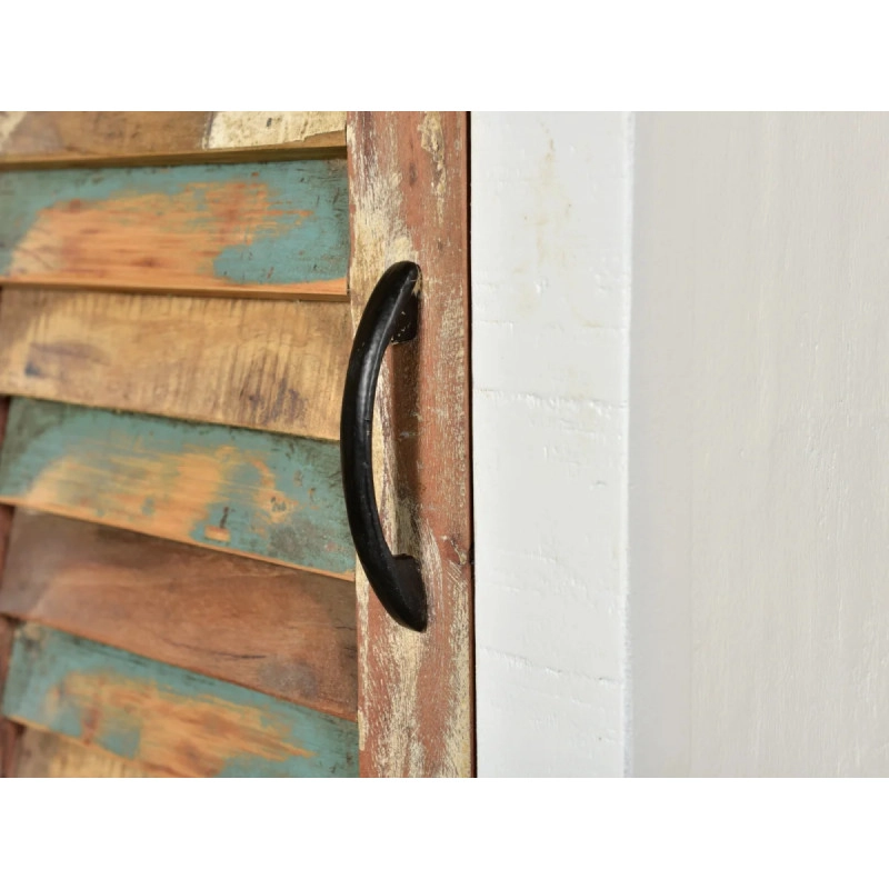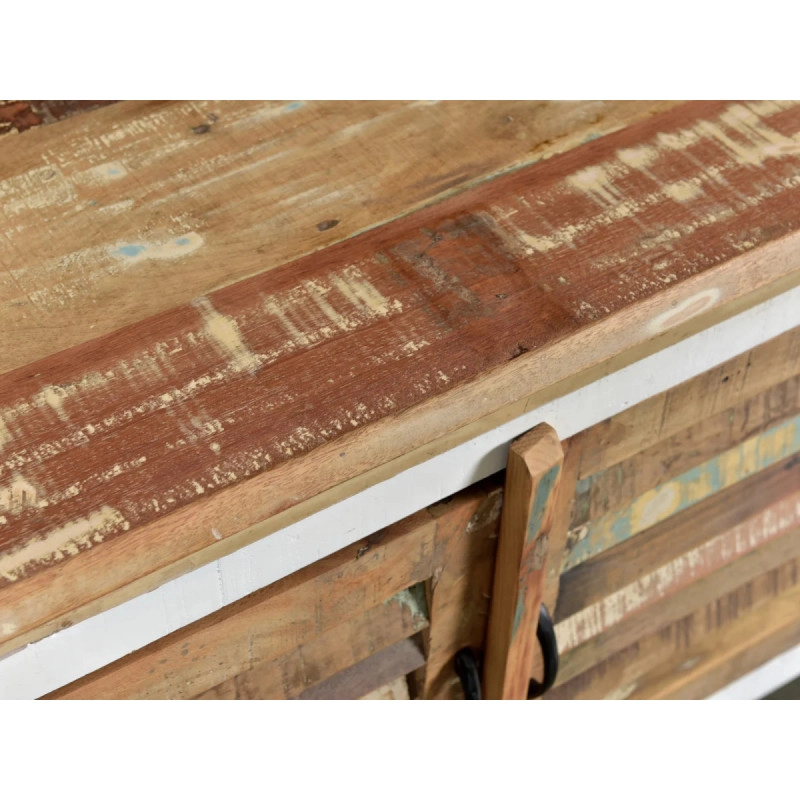 Hľadáte nielen úložný priestor, ale aj originálny kus nábytku, ktorý oživí váš obývací pokoj? Masívna nástenná skriňa Perth z recyklovaného dreva je viac než len praktickým prvkom. Každý kus je unikátny vďaka použitiu lakovaného recyklovaného tvrdého dreva, ktoré so sebou nesie príbeh a charakter minulých rokov. Táto skriňa zaujme na prvý pohľad svojou bielou farbou doplnenou o farebné detaily, ktoré dodávajú celkovému dizajnu svieži a veselý vzhľad.