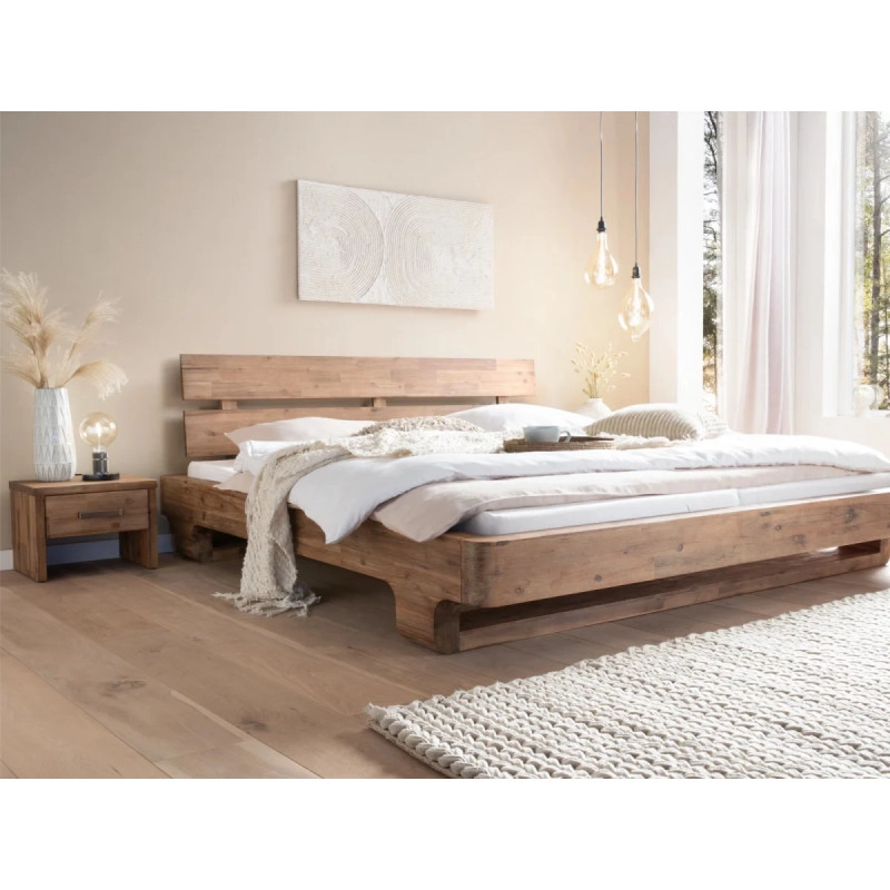 Masívna posteľ Madras, vyrobená z kartáčovaného akáciového dreva v prírodnej hnedej farbe, dodá vašej spálni pocit tepla a pohodlia. Tento robustný kus nábytku o rozmeroch 140x200 cm ponúka kvalitný a pevný základ pre vaše oddychové chvíle.