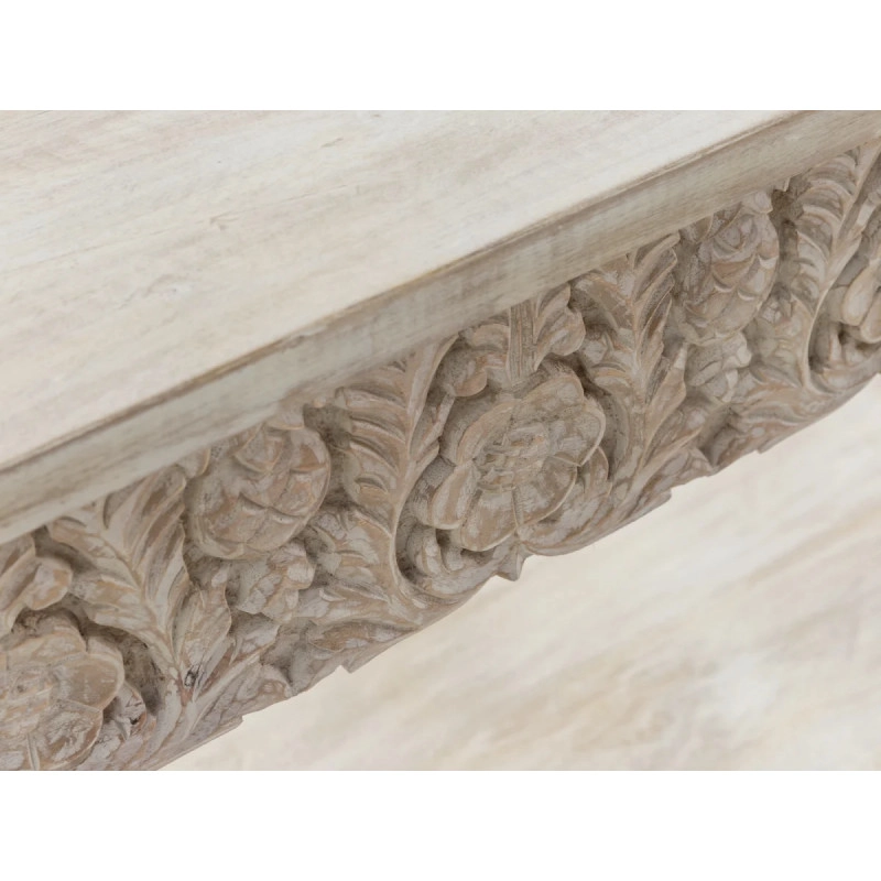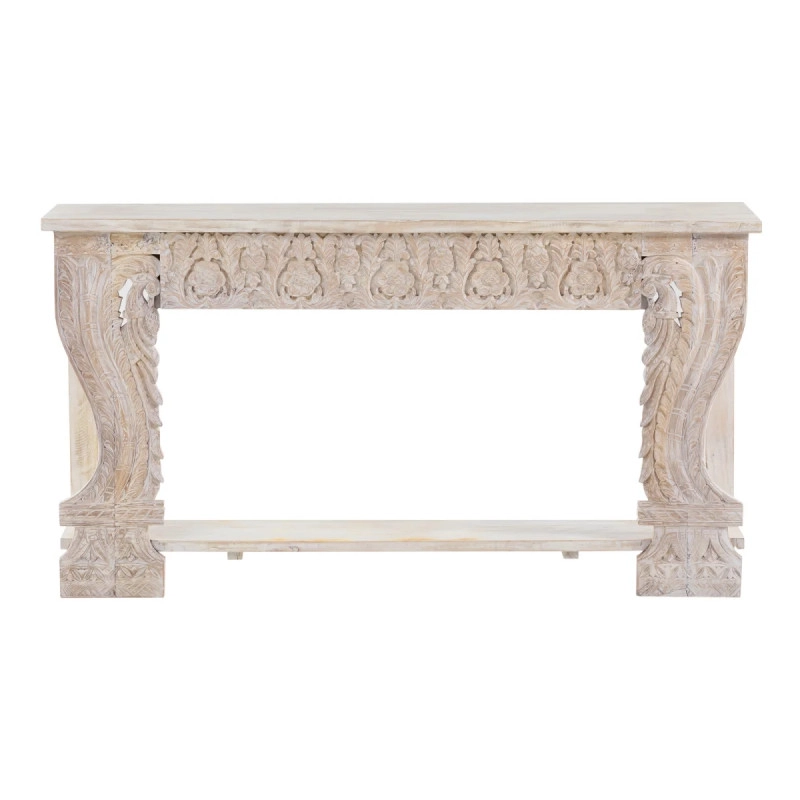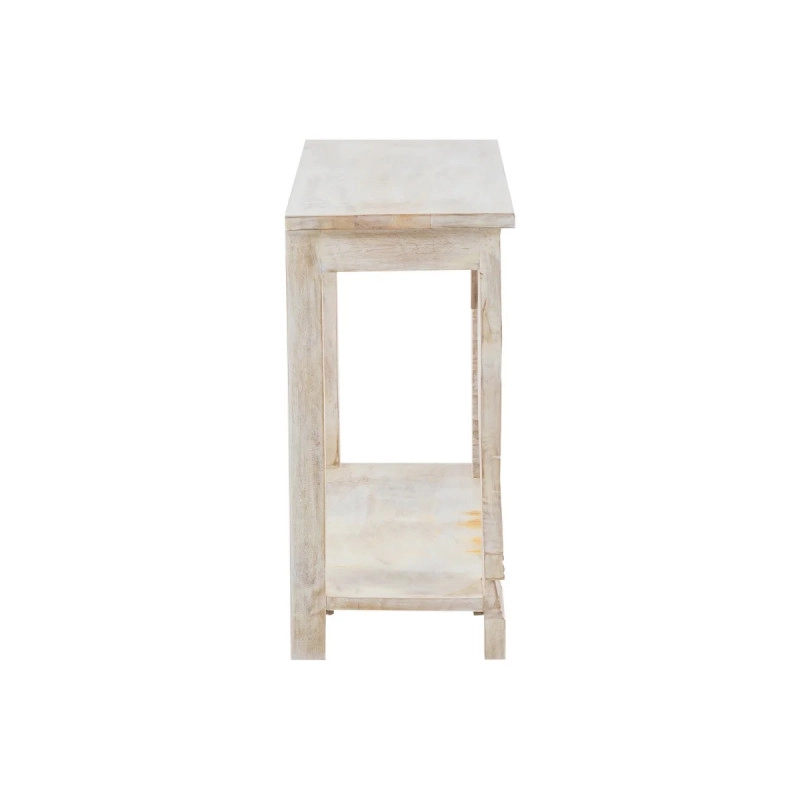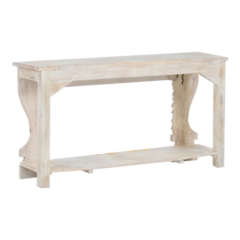 Objednajte si tento elegantný konzolový stolík Damchaya, ktorý spojí praktickosť s moderným dizajnom. Vysokokvalitné mangovníkové drevo, ošetrené lakom v bielej farbe, dodá vášmu obývaciemu pokoju alebo predsieni nádych luxusu a sviežosti, zatiaľ čo praktická polica poskytne dostatok úložného priestoru. Rozmery 150×40×82 cm zaručujú, že sa zmestí aj do menších priestorov.