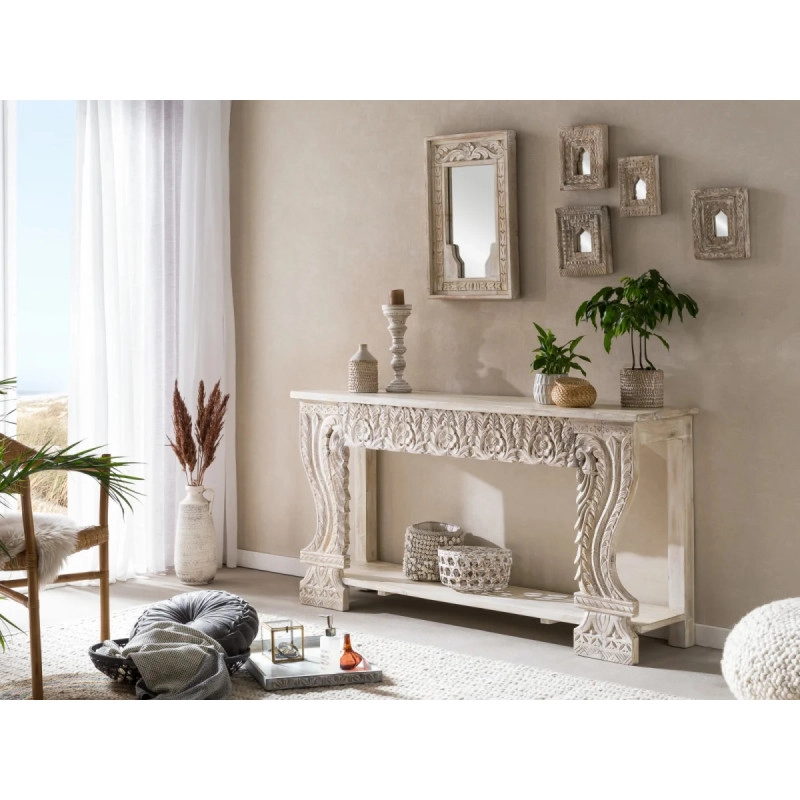 Masívny konzolový stolík s poličkou Damchaya z mangového dreva je skutočným klenotom pre váš obývací priestor, ktorý spája funkčnosť s nadčasovým dizajnom. Jeho elegantná biela farba a lakovaný povrch dodávajú interiéru svieži nádych, zatiaľ čo prirodzená textura mangového dreva zabezpečuje jedinečnosť každého kusu. S rozmermi 150 cm na dĺžku, 40 cm na šírku a 82 cm na výšku sa perfektne hodí do rôznych priestorov, či už ako štýlový toaletný stolík, alebo praktický odkladací priestor pre vaše obľúbené dekorácie. Tento stolík nielenže priťahuje pozornosť svojim moderným vzhľadom, ale tiež poskytuje dostatok úložného priestoru vďaka spodnej poličke, na ktorú môžete umiestniť knihy, kvety alebo ďalšie drobnosti, ktoré dodajú osobitosť vášmu priestoru.